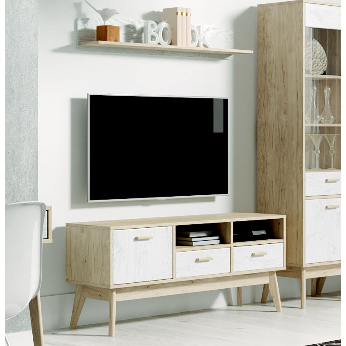 Ультратрендовая гостиная Калгари от Мебельград, выполненная в светлых тонах с элементами сдержанного стиля 60-х - высокие ножки, выраженная деревянная текстура натурального дуба, четкие формы. Вся мебель очень мобильная, компактная, вызывает чуство легкости и свободного пространства, при этом она функциональна.