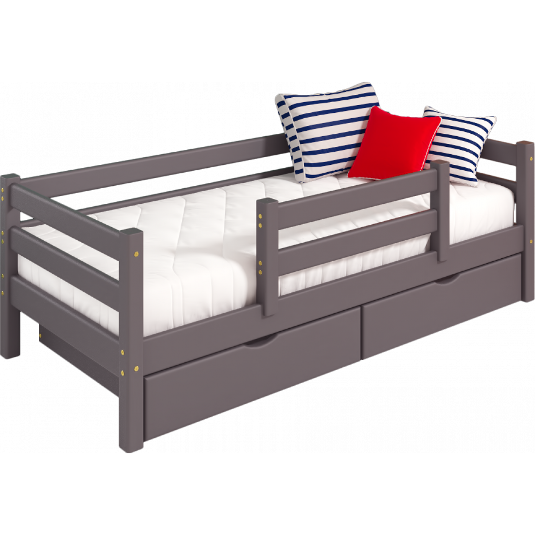 Кровать выполнена из массива дерева, может комплектоваться выкатными ящиками и аксессуарами из текстиля. Отделка выполнена эмалью AqaLAC с добавления красителя цвета "Лаванда".