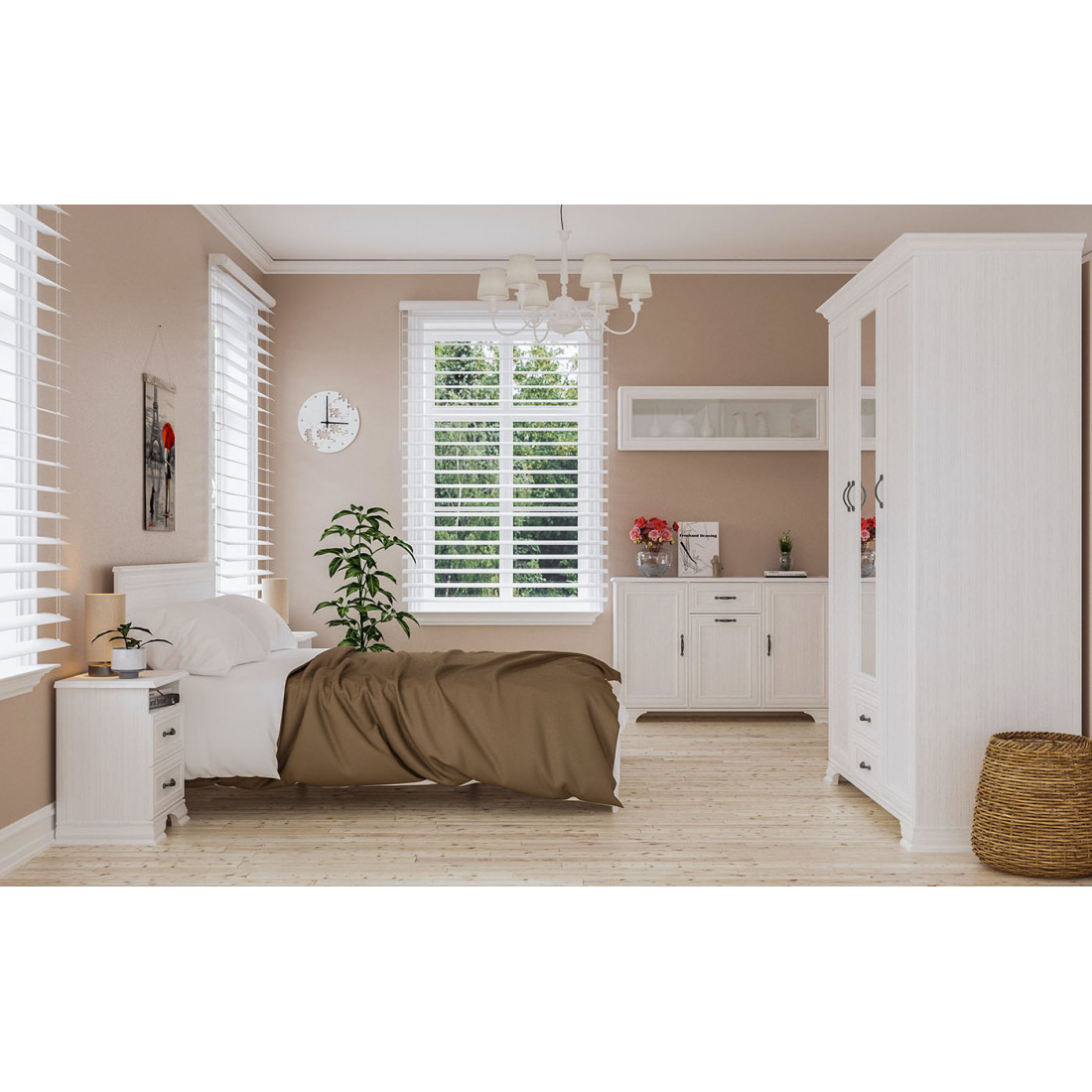 Мебель для спальни Юнона от фабрики Мебель-Неман композиция 4 - спальный гарнитур в классическом стиле с отделкой структурной фактуры, обрамленный рамочным фасадом, где металлические ручки выгодно подчёркивают стиль и изящество, всегда актуален и востребован.